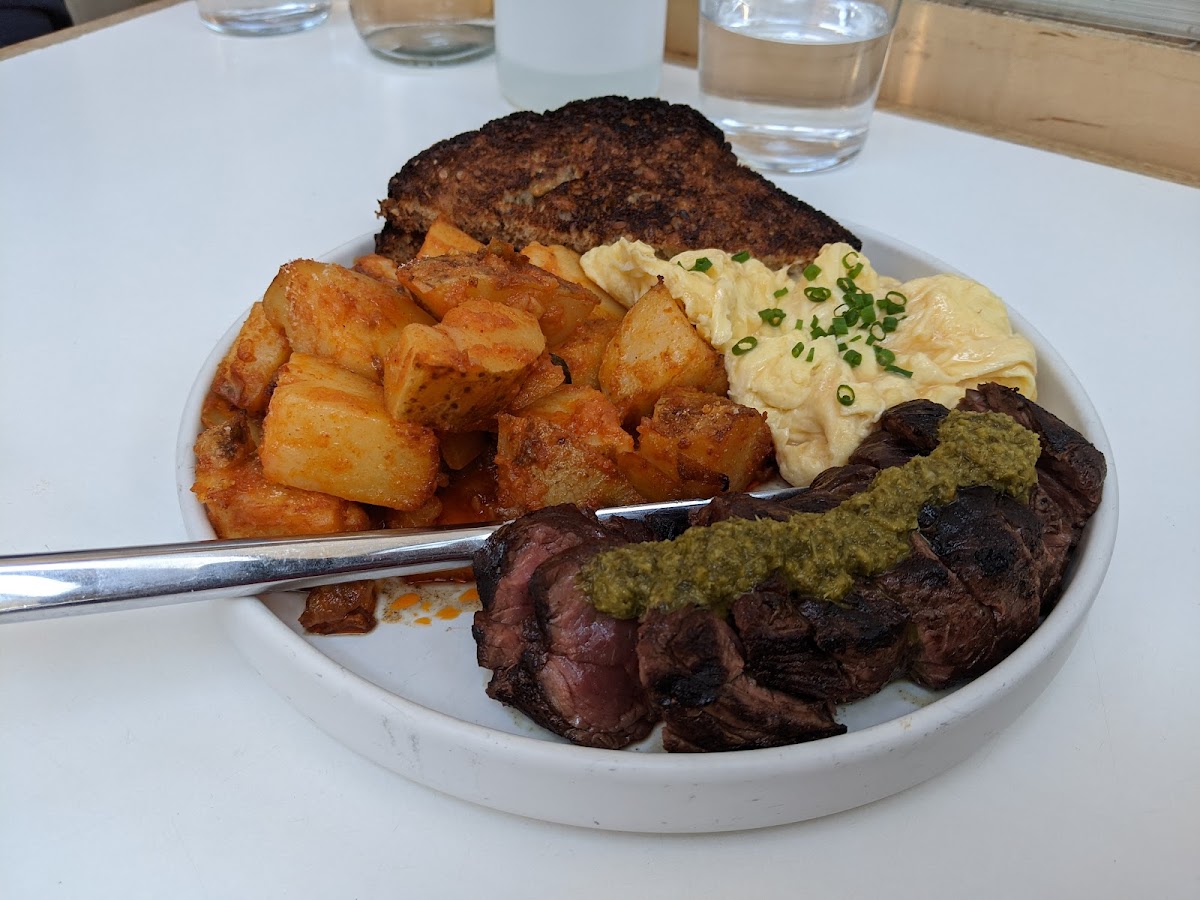 Came here to celebrate my dad's birthday brunch and we were blown away by the food and service. Our server was attentive and had brought in a heater for us as we were seated near the windows on a cold February weekend. They gave my dad a complimentary maple cheddar biscuit with a candle which was a nice gesture. The biscuit was delicious and I'd recommend ordering it. The steak and eggs and cheddar scramble were a big hit with my family. Everyone loved how filling it was and perfectly seasoned. The scrambled eggs were fluffy and soft. The potatoes were crispy and flavorful. The steak was perfectly cooked, tender, and delicious! The Sunday Pancakes were thick (almost cake like) and came with a praline sauce that was so decadent and indulgent. It is a must try and can be shared between 2 people. Although it is a little overpriced for their portion - $17 for a single stack of pancake. I ordered an espresso martini and my sister ordered the honeybear on holiday. I ended up liking her drink more than mine. Overall, my family and I had a wonderful experience and we definitely see this place becoming a go-to for brunch in the future.